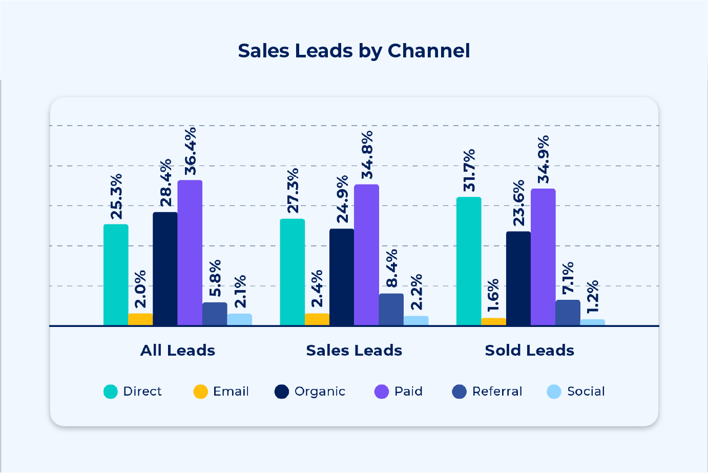 Paid channels were the highest proportion of total sales leads, and for the first year, also the highest rate of leads that eventually bought.