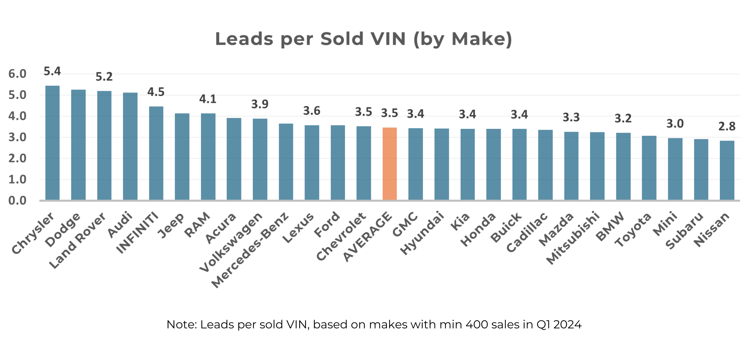 By analyzing leads generated per sold VIN across new 2023 and 2024 models, the study found dealerships received 3.5 leads on average per sale from January 1, 2024 to March 31, 2024.
