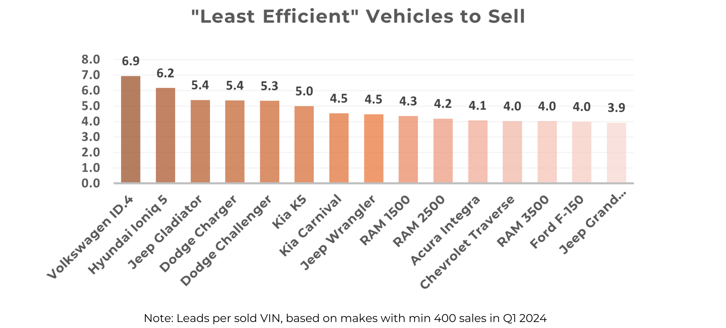 Looking at the least efficient vehicles to sell by make + model, two EVs were atop the list -- the Volkswagen ID.4 (6.9 leads per sale) and the Hyundai Ioniq 5 (6.2). Of the remaining top 15 least efficient vehicles, multiple models appeared from each of Jeep, Dodge, RAM, and Kia.
